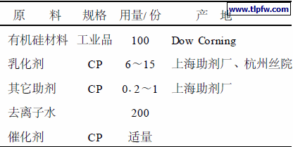 注: 1) 乳液配方为有机硅材料100 份, 水200 份, 司盘3份, 平平加O 3 份, PEG 0.2 份, 其它适量。