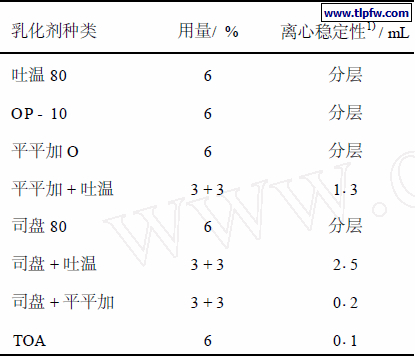 有机硅材料表面张力极低, 而水的表面张力(75 mN/ m) 较大; 所以有机硅材料的乳化极为困难。乳化剂的选择对乳液稳定性的影响至关重要(见表3) 。