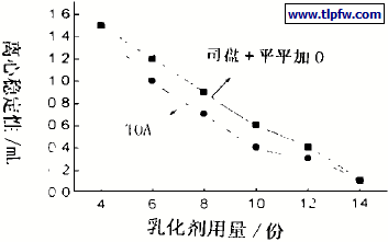 从图1 可知, 当乳化剂用量超过10 份时,乳液稳定性很好; TOA 与吐温+ 平平加的情况基本一致, 最佳用量在6~10 份之间。