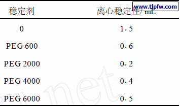 欲得到稳定的乳液型有机硅防水剂, 除应选择适当的乳化剂外, 还需加入少量稳定剂。稳定剂能使有机硅材料的活性基团暂时钝化, 有利于乳液的稳定。具有这些效应的添加剂有: 醛、聚乙二醇( PEG) 和有机氮化合物, 通常选用PEG作稳定剂。PEG 类型对乳液稳定性的影响见表4 。