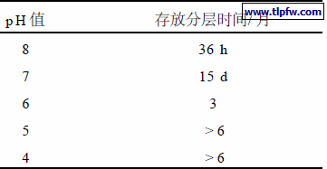 酸碱性也是影响有机硅防水剂乳液稳定性的重要因素(见表5) 。由于有机硅材料中的活性基团在碱性体系中会水解成硅羟基, 随后缩合成网状结构而失效; 因此, 在制备有机硅乳液时必须将体系调至弱酸性。