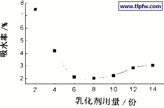 试件制法: 用1 份水泥与6 份中砂制成大于5 MPa 的砂浆体试件; 将防水剂稀释后涂其表面3 遍, 放置24 h 后, 浸水15 min , 测其吸水率。乳化剂用量对吸水率的影响见图2 。