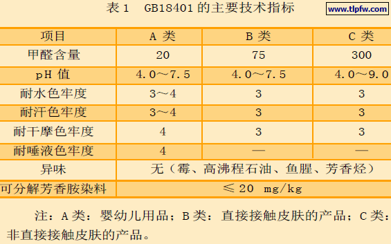 人类赖以生存的自然和环境正引起世界各国的广泛关注。中国作为全球最大的纺织品服装生产和出口国,针对纺织品和纺织化学品在使用过程中是否对人类安全健康以及生存环境带来影响,已逐步引起重视。各国纷纷制定出台相应的法律法规,以引起人们的高度重视。国际上具有代表性的是O e k o -Tex 标准100,它对130 多种有害物质作了限量(或限制)规定。我国2003 年颁布的GB18401-2003国家纺织产品基本安全技术规范(见表1),于2005年1月1日起正式生效实施。