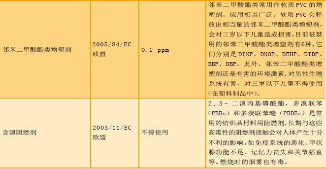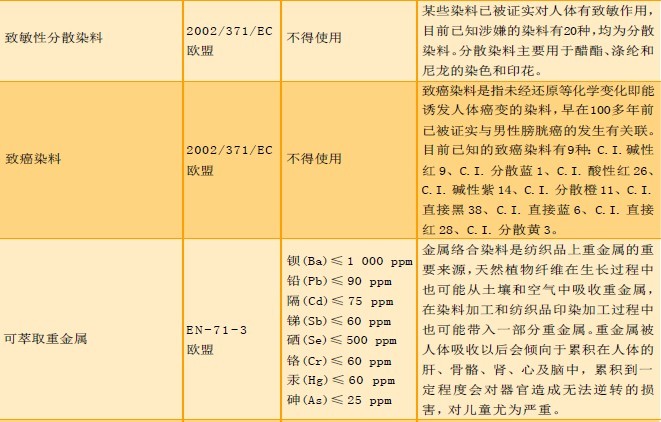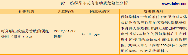 目前我国印花布主要用作服装面料(约占80%),而纺织品印花用着色剂主要是涂料色浆,我国约占2 3 % (全球约占48%)。因此,选择和使用环保型的涂料色浆已经是行业发展的必经之路。我国目前每年对涂料色浆的消耗在4 万吨左右,进口色浆占5% 左右(以高档为主);国产以中低档为主。我国各涂料色浆生产企业尚存在规模小、品质监控手段不全面、环保意识差、管理不到位等不足,因此,部分国产涂料的环保性能是令人担忧的,但有些具备一定规模的企业(如上海油墨泗联化工有限公司)的产品已经过10 多年市场考验,环保性能已得到用户认可。那么,对于印花或印染单位来说,如何认识涂料色浆的环保性能,有的放矢地使用是极其关键的。这里列举国内外具代表性的法律法规,针对纺织品印花范畴的有害物质,从限量要求和危害性作简要分析,以求共勉,见表2。