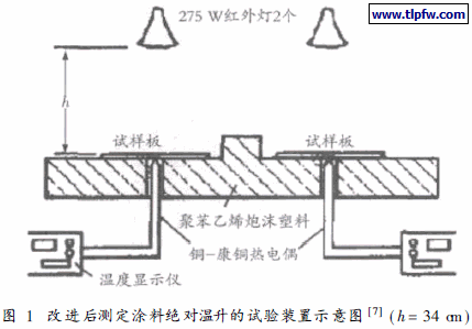 试验在空调室内进行, 控制室温为( 20 +- 2) ºC , 测试前将试板置于空调室内2 h 以上, 以使试板温度与环境温度平衡,测试时紧闭门窗, 保证风速为零。将2 块涂有同一试样的样板放置于红外灯正下方, 板边缘彼此相距50 mm; 记录初始温度, 开启红外灯, 每隔3 m in记录2块样板在同一时间点的下表面温度, 共记录33 m in( 通过试验发现, 样板被照射33 m in后, 其下表面温度变化不超过1ºC , 视为至平衡温度) , 并取2个温度的平均值作为该试样的平衡温度。绝对温升为获得的平衡温度减去初始温度。