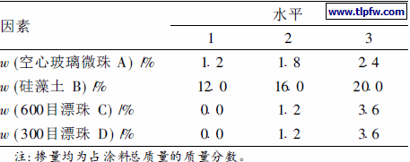 选取空心玻璃微珠、硅藻土及600目漂珠作为阻隔型外墙隔热涂料的功能填料。采用L9 ( 34 ) 正交表进行正交试验。表1为3种材料的因素水平表, 表2为其正交试验结果及数据处理情况。