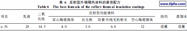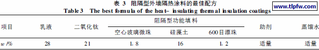 ( 1) 通过正交试验优化了各功能填料掺量, 得出了阻隔型、反射型、辐射型外墙隔热涂料的最佳配方。