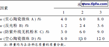 选取实心/空心陶瓷微珠、反光粉、防紫外线无机粉末作为反射型外墙隔热涂料的功能填料。采用L9 ( 34 )正交表进行正交试验。表4为4种材料正交试验的因素水平表, 表5为其正交试验结果及数据处理情况。