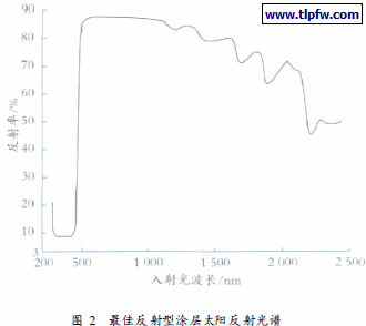 利用表6配方配制而得的反射型外墙隔热涂料, 测得其绝对温升为28.0 % 。结合图2, 计算得到该最佳反射型涂料在波长为250~ 2 500 nm 范围内的太阳反射比为86%。参照JC /T 1040- 2007< 建筑外表面用热反射隔热涂料>中涂层太阳反射比>83%的规定, 可知该反射型涂层的太阳反射比高于标准要求。