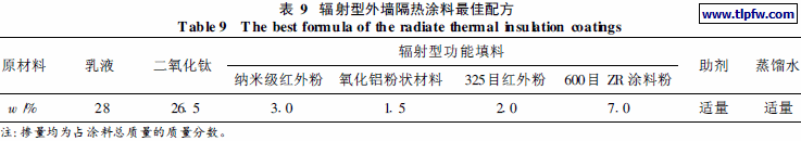 利用表9配方配制而得的最佳辐射型外墙隔热涂料, 测得其绝对温升为30.6 % ; 同时, 笔者委托国家建筑材料测试中心对该最佳辐射型涂料进行了半球发射率测试, 得到该试样的半球发射率为87%, 高于JC /T 1040- 2007 <建筑外表面用热反射隔热涂料>中规定涂层半球发射率> 85%的要求。