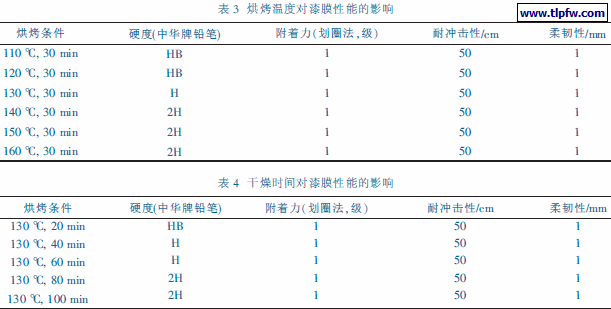 选用基体树脂与氨基树脂的配比为3:1, 考察不同的烘烤条件对漆膜固化交联反应的影响,从而选择合适的烘烤温度和干燥时间。