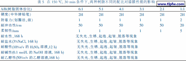 (3)通过考察固化剂的量对漆膜性能的影响,实验表明,在150 ℃, 30 min 的条件下,当两种树脂的配比为6:1~2:1 时, 漆膜的常规性能优良, 其耐水性、耐盐水、耐醇和耐碱均达到168 h 以上,耐体积浓度为10%的硫酸12 h 以上。
