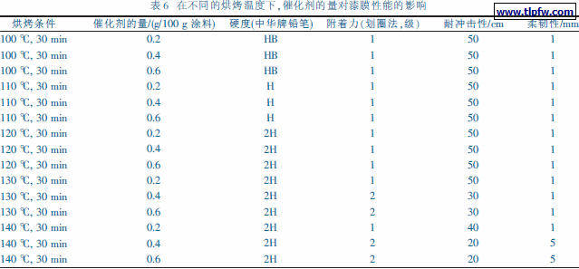 (4)通过考察在不同的烘烤温度下,催化剂的量对漆膜性能的影响,实验表明,当烘烤温度为110 ℃~120 ℃时, 催化剂的量增加对漆膜性能影响小。当烘烤温度为130 ℃~140 ℃时,随着催化剂量的增加,漆膜内应力大,漆膜的柔韧性和耐冲击性能变差。通过比较,选定两种树脂的配比为3:1,催化剂的量为0.2%, 烘烤条件为120 ℃, 30 min 为最优配方设计工艺条件。