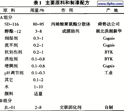 SD一116丙烯酸聚氨酯分散体是一种粒度为纳米级的微乳液,不含甲基吡咯烷酮(NMP)等有机溶剂,具有极好的机械和热稳定性,能够承受制漆过程中研磨和分散的剪切力,不会发生破乳现象。配漆时按100份A组分加2~8份B组分混合均匀即可。由于B组分粘度很小,不需要强力搅拌,手搅即可混匀。配漆后过100~200目滤网,放置15~20 min,使漆液消泡,可用刷涂和喷涂法施工。