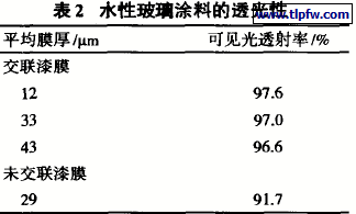 作为玻璃涂料,透光率十分重要。以玻璃板和涂有涂料的玻璃板对比测定可见光的透射率,比较测定了不同膜厚漆膜可见光的透射率。结果发现,这种加有交联固化剂的水性玻璃涂料的可见光透射率达96% 以上,并随膜厚的增加略有降低;而未加交联剂的漆膜透射率要稍微低一些(表2)。高透射率表明这种漆作为玻璃涂料是合适的。