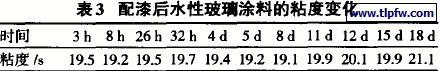 室温固化双组分涂料配漆时存在一个适用期,也称施工时限的问题。超过施工时限,由于两组分化学反应的结果,漆粘度增大,不能良好施工和成膜,甚至凝胶报废,失去使用价值。通常双组分涂料的适用期为数小时,而这里报道的双组分水性玻璃涂料与其它双组分涂料不同,经测定其适用期很长,漆液的涂-4杯粘度在近20 d内变化很小(表3)。实际涂刷后发现,配漆后20ºC下1个月内仍可用。可以认为其使用方便程度与单组分漆相似,一次配漆可保证整个工期都可使用。