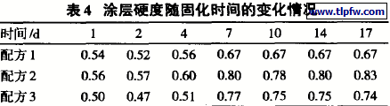 按GB/T 1730中的B法测定涂层硬度,发现初期硬度增长很快,7 d后基本达到最终硬度,也即化学反应基本完全。因此,这种涂料涂装后保证至少7 d的固化期很必要。漆膜硬度随固化时间的变化情况见表4。