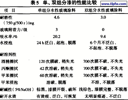 双组分玻璃涂料不怕开水烫,烫后不泛白,不发粘。交联后的漆膜基本消除了单组分漆膜的严重弊病— —热塑性,表现出溶剂型交联聚氨酯漆的效果—— 热固性。