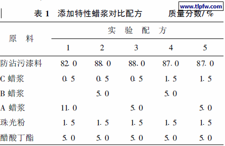 将蜡浆加入防沾污漆料中, 高速分散使细度小于25um, 再将珠光粉用醋酸丁酯润湿后, 加入分散好的漆料中, 中速分散1 h 左右, 使珠光粉均匀地分布在漆料中, 实验配方如表1 所示。