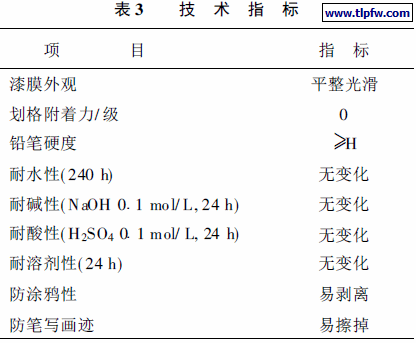漆膜外观、光泽、划格试验、硬度、防涂鸦性、防笔写画迹测试是烘烤后在恒温恒湿条件下放1 h 后检测, 耐水性、耐碱性、耐酸性和耐溶剂性测试是在烘烤后恒温恒湿条件下放48 h 后检测。