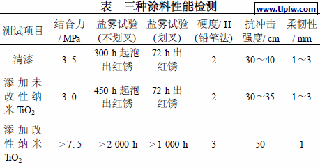 由表可见,添加改性纳米TiO2 后,涂层的结合力、耐盐雾性、抗划痕性和柔韧性能大大提高,抗冲击强度也有所增大。