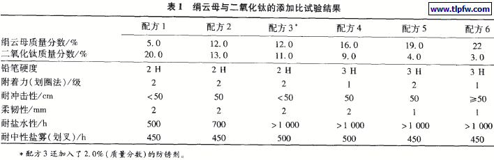 试验结果见表1,在表1中调整绢云母和二氧化钛的添加量,分别进行了不同添加比例试验,试验结果表明,增加绢云母用量,降低二氧化钛用量,对涂膜的化学性能没有不良影响,在物理性能上其硬度、附着力、柔韧性、耐冲击性有一定程度的提高(见配方6和配方1)。而减少了钛白粉的用量,则使涂料成本大大降低。