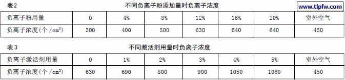 (2)当负离子粉添加12% 时,再添加4% 负离子激活剂,可使漆膜释放负离子浓度达到1000 个/cm3 左右。