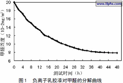 选择一间约20m2 的房间,在房间内按正常施工程序涂刷可释放负离子乳胶漆,测试在乳胶漆干燥1 个月后进行。试验时,首先测试室内负离子浓度,再向测试室内释放甲醛,测得甲醛初始浓度,然后密闭房间,按固定的采样周期测试室内甲醛浓度。测试时,甲醛的初始浓度为0.2mg/m3(GB/T18883 - 2002 规定室内的甲醛浓度限值为0.1mg/m 3 ),测试持续4 8 h ,采样周期2 h 。