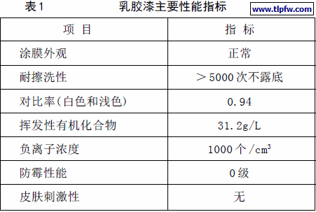 选择一间约20m2 的房间,在房间内按正常施工程序涂刷可释放负离子乳胶漆,负离子检测在乳胶漆干燥1 个月后进行。检测方法为:房间密闭24 小时后,用空气负离子分析仪测定室内空气负离子的浓度。乳胶漆的其他指标按G B / T 9 7 5 6 - 2001 和GB18582 - 2001 执行。乳胶漆主要性能见表1。