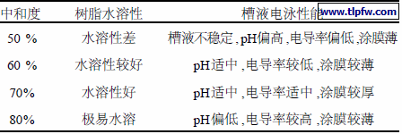环氧树脂的选择对基料树脂的水溶性和涂膜性能影响较大。环氧树脂分子量较低时,涂膜电泳性能差,涂膜发粘;分子量较高时,基料树脂水溶性较差,漆液稳定性不好。实验选择环氧当量为450~550 g/ eq的E-20,其分子量大小适中,采用二乙醇胺对其进行阳离子化改性,最后用冰醋酸中和。中和度的高低控制着基料树脂的水溶性,也直接影响槽液的pH、电导率值和电泳性能,如表4所示。控制中和度在60% ~70%左右,树脂水溶性较好,槽液的pH和电导率值适中,涂膜较厚。