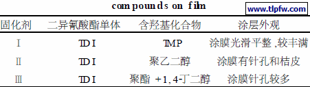 本实验以TD I-80 为二异氰酸酯单体,选用不同的含活泼氢的羟基化合物来制备多异氰酸酯预聚物。能与TD I反应的含活泼氢的羟基化合物,根据分子量的大小,大致可以分成两大类:一类是低分子量的醇,如TMP、1, 4-丁二醇;一类为含羟基的高分子化合物,一般由多元醇、多元酸等聚合反应而得到,常作为聚氨酯涂料的羟基组分,如各种含羟基的聚醚、聚酯树脂等。对于含活泼氢的羟基化合物,一般要求: (1)与树脂组分有很好的混溶性; ( 2)要有足够的羟值; (3)无水分和其它杂质,酸价尽可能的低。实验比较了几种含活泼氢的羟基化合物与TD I反应制备的封闭交联剂对最终漆膜性能的影响,结果见表1。由表1可以看出,采用TMP的涂膜其外观较好。本实验最终选用TMP作为羟基化合物来制备封闭交联剂。