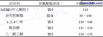 出于节能和应用于热敏材料的考虑,近年来环氧聚氨酯涂料向低温固化方向发展。采用低温解封的固化交联剂是制备低温固化阴极电泳涂料的一种技术手段。采用TD I280制备封闭固化交联剂时,常用的封闭剂有酰胺、醚醇、酮肟等,解封温度一般在130~150 ℃,见表2所示。