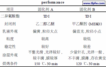 从表3可以看出,采用MEKO作封闭剂,虽然烘烤温度较低,但树脂乳液贮存稳定性较差,最终漆膜外观较差,还存在黄变现象。而用乙二醇乙醚作封闭剂,涂膜外观较好。结合固化温度和涂膜外观,实验选择乙二醇乙醚为封闭剂, 最终涂膜烘烤条件为150 ℃、30 min。