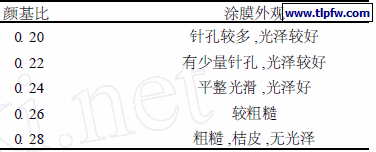 色漆配制时颜基比的确定对涂膜的性能至关重要。颜基比失调,会导致涂膜的外观质量和抗腐蚀能力变差。本实验比较了几种颜基比下涂膜的性能,见表6所示。