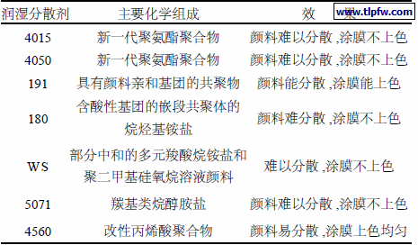 色漆配制时颜料的研磨分散也是影响涂料贮存稳定性和涂膜性能的一个主要因素。选择合适的润湿分散剂是分散颜料的关键。以碳黑为颜料,表7中比较了几种润湿分散剂的效果。实验最终选择4560型分散碳黑,效果较好。