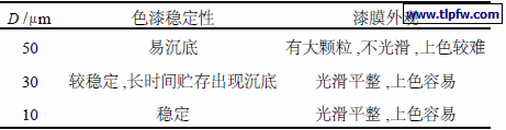 色浆的研磨细度对颜料的着色影响较大。一般色浆研磨得越细,颜料的遮盖力、着色力越好。但受研磨设备和工作效率的控制,色浆细度不可能太细。综合比较(见表8所示) ,将色浆研磨到30 μm以下,色浆贮存稳定,最终涂膜外观平整,附着力好。