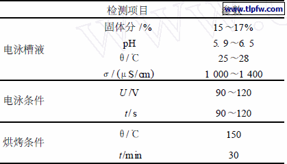 取所配制的色漆于电泳槽中,以不锈钢作阳极,已经过前处理后的被涂物马口铁片作阴极,用直流稳压电泳仪电泳。电泳结束后,冲洗浮漆,自然晾干,在一定温度下烘烤固化,并检测涂膜性能。