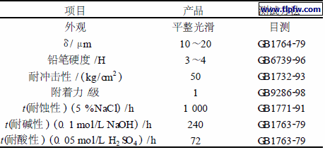 实验选用马口铁为被涂物进行电泳,然后将漆膜烘烤固化,各控制条件见表9所示。在实验所确定的较优条件下制得的涂料最终涂膜性能见表10所示。