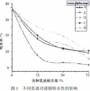 ( 2) 漆膜吸水性测试 在四氟乙烯板上用100um 涂膜涂布器制膜, 干燥一周后用刀片掀下, 剪成规整面积, 称重W1. 将漆膜置于自来水中浸泡24 h后取出, 用滤纸吸干表面水, 再次称重W2 . 吸水率=