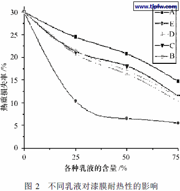 漆膜耐热性分析结果如图2 所示. Si- O 键的键能为443. 8 kJ/ mol , 而C – C 键的键能为347kJ/ mol , 且Si- O 键的极性大[ 6] , 有51% 的离子化倾向, 对烷基有偶极感应作用, 这就提高了C- C 链对氧化作用的稳定性. 由图2 可见, 有机硅乳胶改性后的乳胶漆耐热性比纯丙乳胶漆有明显的提高. 而且乳液E 改性的乳胶漆耐热性远远胜于其它系列改性的乳胶漆, 原因在于二者良好的相容性使得形成的复合体系结构均匀, 从而更好地起到了保护作用. 另外该树脂与丙烯酸树脂也可能有部分反应.