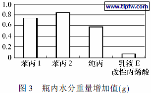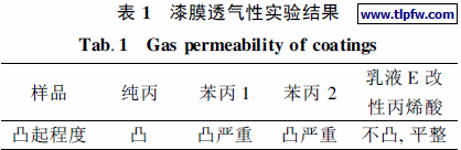 选用纯丙乳液和进口苯丙1 乳液, 国产苯丙2乳液及乳液E 改性丙烯酸乳液制膜. 控制膜厚一致. 各漆膜透气性结果如表1.
