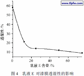 将多只样品测试瓶在装有湿度装置的恒温箱中放置24 h 后, 测量瓶内水分的重量增加值, 取其平均值, 结果如图3. 由图可知, 乳液E 改性丙烯酸漆膜的透湿量最小, 而苯丙透湿量最大. 这与漆膜的结构和性质有关.又以乳液E 与纯丙共混, 共混比例如下: E1( E:12. 5w t% ) , E2( E: 25wt% ) , E3( E: 50w t%) , E4( E:75w t% ) . 将多种共混乳液制膜, 测其漆膜的透湿性, 结果见图4. 由图可知, 随着乳液E 含量增加, 漆膜透湿量减少. 当E 含量达50%后, 透湿性改变已很小. 考虑到生产成本, 建议使用30% 含量即可.