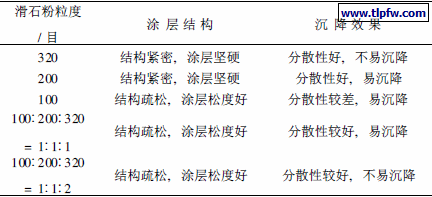 由于产品性能的要求所致, 腻子表层不能太坚硬, 即打磨松度好, 并且填料粒度大, 表面涂层结构比较疏松, 固化后的腻子涂层松度也较好。但是, 填料粒度大, 沉降较快, 不利于防沉, 且分散性也较差, 因此, 可从主填料不同粒度的滑石粉配比来满足防沉与涂层松度的要求。