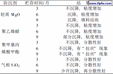 表2 为用不同防沉剂制备腻子的贮存情况, 从中可以看出, 对于母体为不饱和聚酯腻子来说, 由于其产品的填料加入量大, 要使填料在长时间内不发生沉降, 又不影响腻子其它产品性能, 经过反复试验得出, 在4kg 腻子中加入32g 气相S iO2 为最佳, 其添加工艺采用母料法为佳。