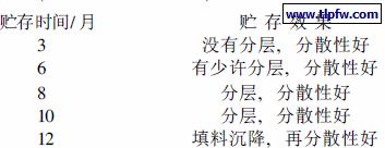 将4kg 产品装入密封镀锌铁桶内, 存放于25 ºc ~ 28 ºc 下测试实际的贮存期。其时间以树脂与填料不分层或分层后通过人工轻微搅拌可再分散为产品的贮存有效期。
