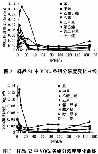 由图2 可见,样品S1 中以二甲苯的浓度最高。二甲苯的单组分浓度峰值出现在散发开始后8 h 左右,在之前表现为急剧的增长阶段,之后随着二甲苯散发强度的减小和进入环境舱的清洁空气的稀释,表现为浓度迅速下降阶段。在整个释放阶段的后期,二甲苯的浓度曲线较为平缓。其它2 种主要VOCs 组分为甲苯和乙苯。甲苯和乙苯的浓度较邻(间)二甲苯低,但释放规律和二甲苯颇为一致。其它几种组分的释放曲线更加趋于平缓,其各个时间段的释放浓度更低。