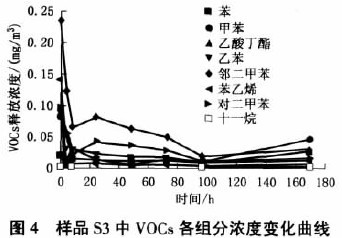 由图4 可见,与其它2 种涂料样品不同,样品S3 中最主要的VOCs 组分是邻二甲苯。样品S3 中VOCs 散发很快就达到最高值,之后浓度下降很快。但是下降到一定程度后,下降趋势趋于缓和,这时的VOCs 整体释放浓度仍然偏高。整体来看,样品S3 的VOCs 平均浓度为3 种样品中最高。