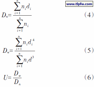 用JEM-200CX 型透射电子显微镜观察稀释后的乳胶粒,然后在电镜照片中选取一定数目的乳胶粒,按式(4)计算乳胶粒的数均粒径Dn,按式(5)计算乳胶粒的重均粒径Dw,按式(6)计算乳胶粒的分散系数U。若U 小于1.05,可将体系视为单分散体系。