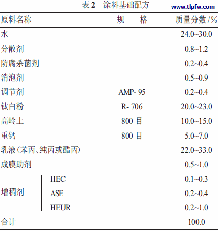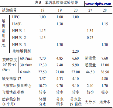 通过上述一系列试验,利用不同流变剂的不同机理,采用不同品种、用量和不同配合的纤维素类、丙烯酸类、聚氨酯类及其缔合型增稠剂,利用涂刷一定面积、在地面收集飞溅点的方法,筛选出对醋丙、苯丙、纯丙类乳胶漆贮存稳定性和抗飞溅性有较好作用的流变助剂及其组合。