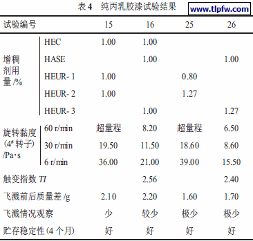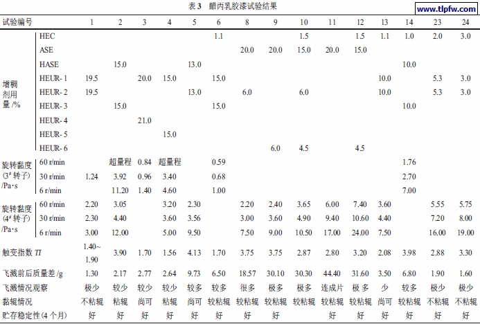 按前述配方,在每1 000 g 醋丙乳胶漆中加入不同量、不同品种的增稠剂,试验结果见表3。